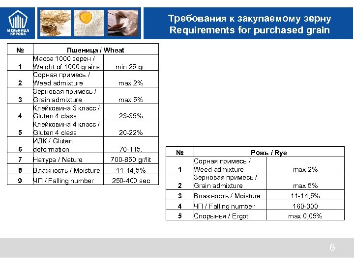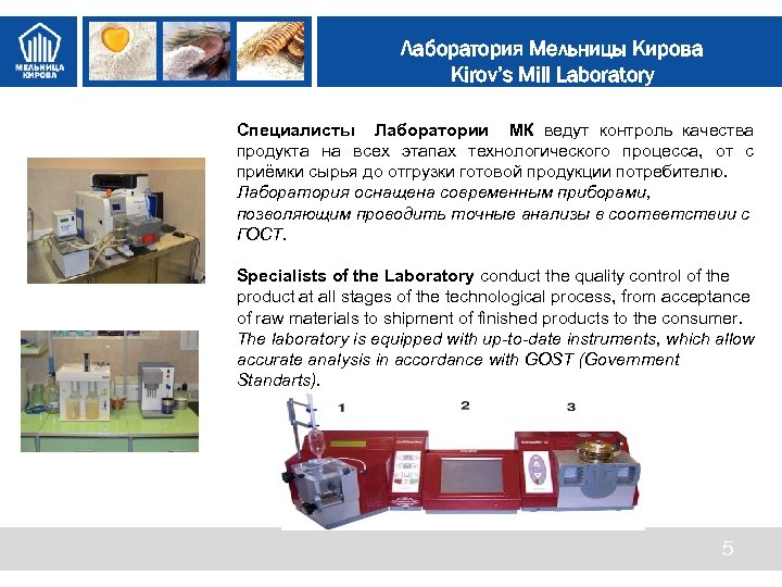 Ценности МК Лаборатория Мельницы Кирова Kirov’s Mill Laboratory Специалисты Лаборатории МК ведут контроль качества продукта на всех этапах технологического процесса, от с приёмки сырья до отгрузки готовой продукции потребителю. Лаборатория оснащена современным приборами, позволяющим проводить точные анализы в соответствии с ГОСТ. Specialists of the Laboratory conduct the quality control of the product at all stages of the technological process, from acceptance of raw materials to shipment of finished products to the consumer. The laboratory is equipped with up-to-date instruments, which allow accurate analysis in accordance with GOST (Government Standarts). 5