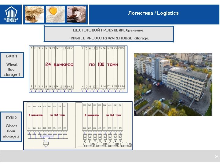 Логистика / Logistics ЦЕХ ГОТОВОЙ ПРОДУКЦИИ. Хранение. FINISHED PRODUCTS WAREHOUSE. Storage. БХМ 1 Wheat flour storage 1 БХМ 2 Wheat flour storage 2 8