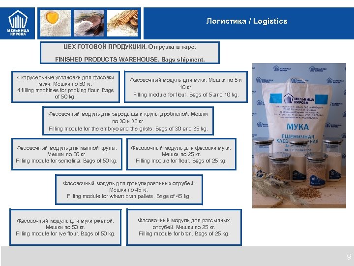 Логистика / Logistics Ценности МК ЦЕХ ГОТОВОЙ ПРОДУКЦИИ. Отгрузка в таре. FINISHED PRODUCTS WAREHOUSE. Bags shipment. 4 карусельные установки для фасовки муки. Мешки по 50 кг. 4 filling machines for packing flour. Bags of 50 kg. Фасовочный модуль для муки. Мешки по 5 и 10 кг. Filling module for flour. Bags of 5 and 10 kg. Фасовочный модуль для зародыша и крупы дробленой. Мешки по 30 и 35 кг. Filling module for the embryo and the grists. Bags of 30 and 35 kg. Фасовочный модуль для манной крупы. Мешки по 50 кг. Filling module for semolina. Bags of 50 kg. Фасовочный модуль для фасовки муки. Мешки по 25 кг. Filling module for flour. Bags of 25 kg. Фасовочный модуль для гранулированных отрубей. Мешки по 45 кг. Filling module for wheat bran pellets. Bags of 45 kg. Фасовочный модуль для муки ржаной. Мешки по 50 кг. Filling module for rye flour. Bags of 50 kg. Фасовочный модуль для рассыпных отрубей. Мешки по 25 кг. Filling module for bran. Bags of 25 kg. 9