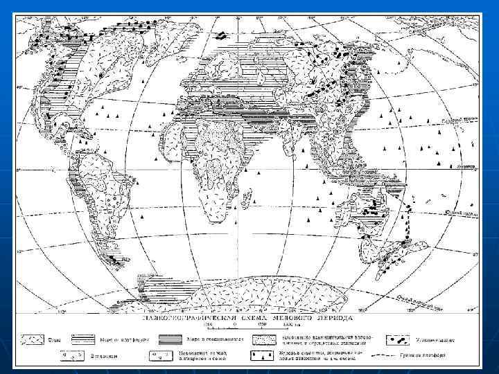 Положение литосферных плит и срединноокеанических хребтов в позднемеловой эпохе n В течение мелового периода на нашей планете продолжался "великий раскол" материков. Громадные массивы суши, образовывавшие Лавразию и Гондвану, постепенно распадались на части. Южная Америка и Африка удалялись друг от друга, и Атлантический океан становился все шире и шире. Африка, Индия и Австралия также начали расходиться в разные стороны, и к югу от экватора в итоге образовались гигантские острова. Большая часть территории современной