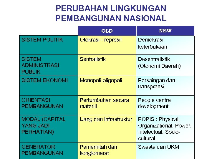 PERUBAHAN LINGKUNGAN PEMBANGUNAN NASIONAL OLD NEW SISTEM POLITIK Otokrasi - represif Demokrasi keterbukaan SISTEM ADMINISTRASI PUBLIK Sentralistik Desentralistik (Otonomi Daerah) SISTEM EKONOMI Monopoli oligopoli Persaingan dan transpransi ORIENTASI PEMBANGUNAN Pertumbuhan secara materiil People centre development MODAL (CAPITAL YANG JADI PERHATIAN) Uang dan infrastruktur POPIS : Physical, Organizational, Power, Intelectual, Sociocultural GENERATOR PEMBANGUNAN Pemerintah dan konglomerat Swasta dan UKM