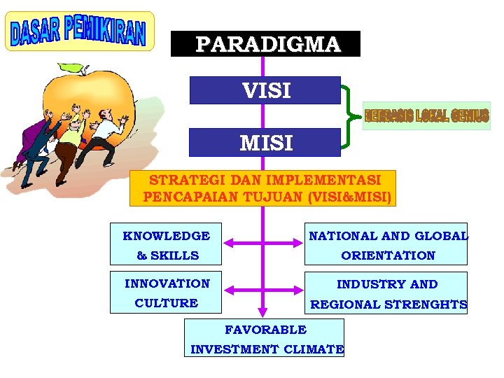 PARADIGMA VISI MISI STRATEGI DAN IMPLEMENTASI PENCAPAIAN TUJUAN (VISI&MISI) KNOWLEDGE NATIONAL AND GLOBAL & SKILLS ORIENTATION INNOVATION INDUSTRY AND CULTURE REGIONAL STRENGHTS FAVORABLE INVESTMENT CLIMATE