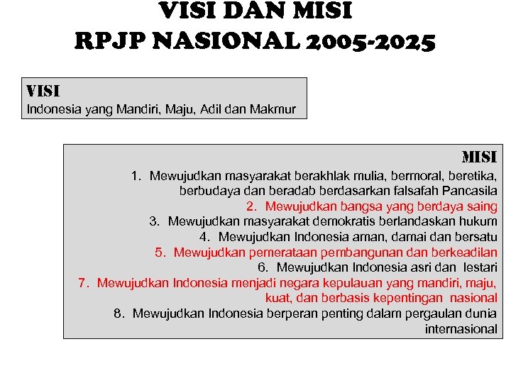 VISI DAN MISI RPJP NASIONAL 2005 -2025 Visi Indonesia yang Mandiri, Maju, Adil dan Makmur Misi 1. Mewujudkan masyarakat berakhlak mulia, bermoral, beretika, berbudaya dan beradab berdasarkan falsafah Pancasila 2. Mewujudkan bangsa yang berdaya saing 3. Mewujudkan masyarakat demokratis berlandaskan hukum 4. Mewujudkan Indonesia aman, damai dan bersatu 5. Mewujudkan pemerataan pembangunan dan berkeadilan 6. Mewujudkan Indonesia asri dan lestari 7. Mewujudkan Indonesia menjadi negara kepulauan yang mandiri, maju, kuat, dan berbasis kepentingan nasional 8. Mewujudkan Indonesia berperan penting dalam pergaulan dunia internasional
