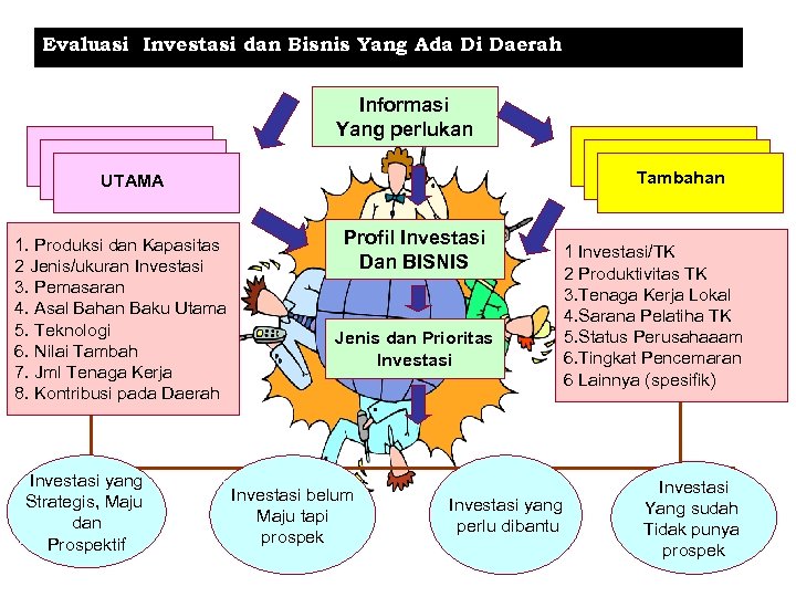 Evaluasi Investasi dan Bisnis Yang Ada Di Daerah Informasi Yang perlukan Tambahan UTAMA 1. Produksi dan Kapasitas 2 Jenis/ukuran Investasi 3. Pemasaran 4. Asal Bahan Baku Utama 5. Teknologi 6. Nilai Tambah 7. Jml Tenaga Kerja 8. Kontribusi pada Daerah Investasi yang Strategis, Maju dan Prospektif Profil Investasi Dan BISNIS Jenis dan Prioritas Investasi belum Maju tapi prospek Investasi yang perlu dibantu 1 Investasi/TK 2 Produktivitas TK 3. Tenaga Kerja Lokal 4. Sarana Pelatiha TK 5. Status Perusahaaam 6. Tingkat Pencemaran 6 Lainnya (spesifik) Investasi Yang sudah Tidak punya prospek