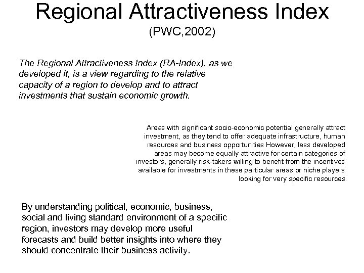 Regional Attractiveness Index (PWC, 2002) The Regional Attractiveness Index (RA-Index), as we developed it, is a view regarding to the relative capacity of a region to develop and to attract investments that sustain economic growth. Areas with significant socio-economic potential generally attract investment, as they tend to offer adequate infrastructure, human resources and business opportunities However, less developed areas may become equally attractive for certain categories of investors, generally risk-takers willing to benefit from the incentives available for investments in these particular areas or niche players looking for very specific resources. By understanding political, economic, business, social and living standard environment of a specific region, investors may develop more useful forecasts and build better insights into where they should concentrate their business activity.
