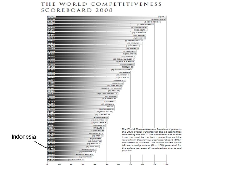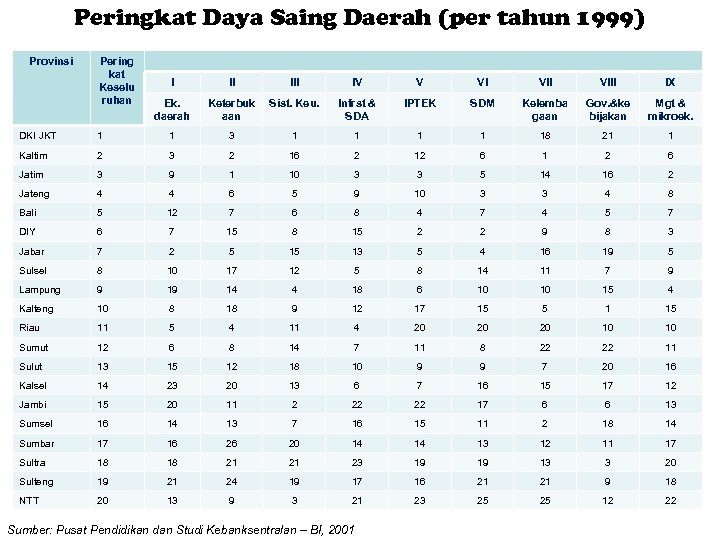 Peringkat Daya Saing Daerah (per tahun 1999) Provinsi Pering kat Keselu ruhan I II IV V VI VIII IX Ek. daerah Keterbuk aan Sist. Keu. Infrst & SDA IPTEK SDM Kelemba gaan Gov. &ke bijakan Mgt & mikroek. DKI JKT 1 1 3 1 1 18 21 1 Kaltim 2 3 2 16 2 12 6 1 2 6 Jatim 3 9 1 10 3 3 5 14 16 2 Jateng 4 4 6 5 9 10 3 3 4 8 Bali 5 12 7 6 8 4 7 4 5 7 DIY 6 7 15 8 15 2 2 9 8 3 Jabar 7 2 5 15 13 5 4 16 19 5 Sulsel 8 10 17 12 5 8 14 11 7 9 Lampung 9 19 14 4 18 6 10 10 15 4 Kalteng 10 8 18 9 12 17 15 5 1 15 Riau 11 5 4 11 4 20 20 20 10 10 Sumut 12 6 8 14 7 11 8 22 22 11 Sulut 13 15 12 18 10 9 9 7 20 16 Kalsel 14 23 20 13 6 7 16 15 17 12 Jambi 15 20 11 2 22 22 17 6 6 13 Sumsel 16 14 13 7 16 15 11 2 18 14 Sumbar 17 16 26 20 14 14 13 12 11 17 Sultra 18 18 21 21 23 19 19 13 3 20 Sulteng 19 21 24 19 17 16 21 21 9 18 NTT 20 13 9 3 21 23 25 25 12 22 Sumber: Pusat Pendidikan dan Studi Kebanksentralan – BI, 2001