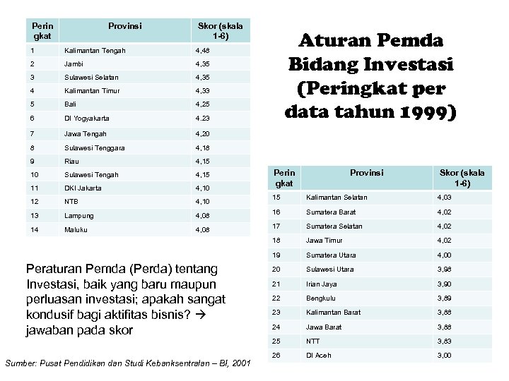 Perin gkat Provinsi Skor (skala 1 -6) 1 Kalimantan Tengah 2 Jambi 4, 35 3 Sulawesi Selatan 4, 35 4 Kalimantan Timur 4, 33 5 Bali 4, 25 6 DI Yogyakarta 4. 23 7 Jawa Tengah 4, 20 8 Sulawesi Tenggara 4, 18 9 Riau 4, 15 10 Sulawesi Tengah 4, 15 11 DKI Jakarta 4, 10 12 NTB 4, 10 13 Lampung 14 Maluku Aturan Pemda Bidang Investasi (Peringkat per data tahun 1999) 4, 48 Perin gkat Provinsi Skor (skala 1 -6) 15 Kalimantan Selatan 4, 03 4, 08 16 Sumatera Barat 4, 02 4, 08 17 Sumatera Selatan 4, 02 18 Jawa Timur 4, 02 19 Sumatera Utara 4, 00 20 Sulawesi Utara 3, 98 21 Irian Jaya 3, 90 22 Bengkulu 3, 89 23 Kalimantan Barat 3, 88 24 Jawa Barat 3, 88 25 NTT 3, 83 26 DI Aceh 3, 00 Peraturan Pemda (Perda) tentang Investasi, baik yang baru maupun perluasan investasi; apakah sangat kondusif bagi aktifitas bisnis? jawaban pada skor Sumber: Pusat Pendidikan dan Studi Kebanksentralan – BI, 2001