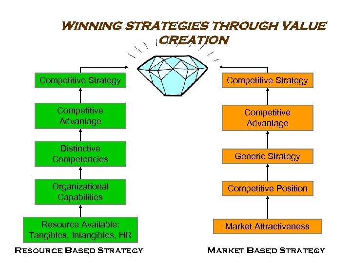 WINNING STRATEGIES THROUGH VALUE CREATION Competitive Strategy Competitive Advantage Distinctive Competencies Generic Strategy Organizational Capabilities Competitive Position Resource Available: Tangibles, Intangibles, HR Market Attractiveness Resource Based Strategy Market Based Strategy