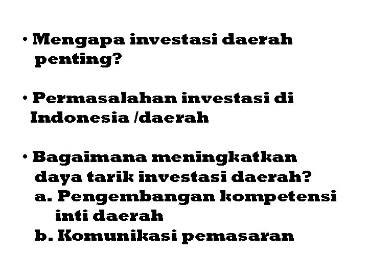 • Mengapa investasi daerah penting? • Permasalahan investasi di Indonesia /daerah • Bagaimana meningkatkan daya tarik investasi daerah? a. Pengembangan kompetensi inti daerah b. Komunikasi pemasaran