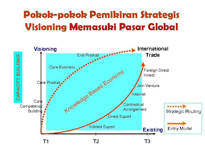 Pokok-pokok Pemikiran Strategis Visioning Memasuki Pasar Global International Trade CAPACITY BUILDING Visioning End Product Core Business my o Core Product se Ba e dg Core Competency Building Kn n co d. E Join Venture Internet e wl o Contractual Arrangement Strategic Routing Direct Export Indirect Export T 1 Foreign Direct Invest. T 2 Existing Entry Model T 3
