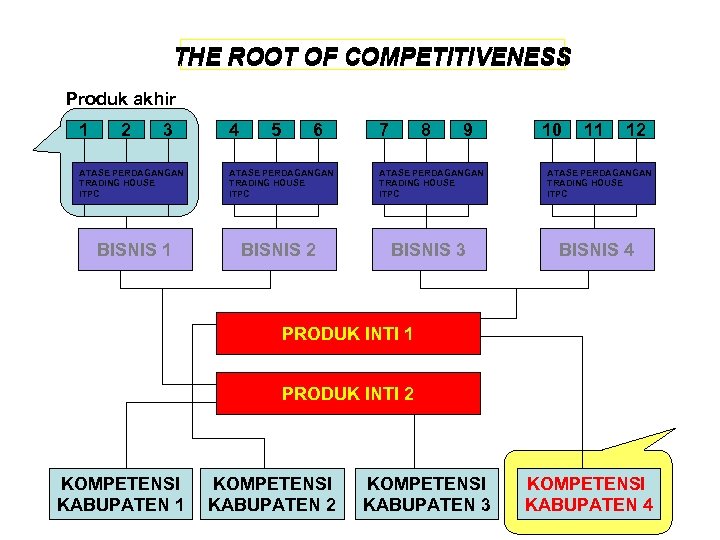 THE ROOT OF COMPETITIVENESS Produk akhir 1 2 3 ATASE PERDAGANGAN TRADING HOUSE ITPC BISNIS 1 4 5 6 7 8 9 10 11 12 ATASE PERDAGANGAN TRADING HOUSE ITPC BISNIS 2 BISNIS 3 BISNIS 4 PRODUK INTI 1 PRODUK INTI 2 KOMPETENSI KABUPATEN 1 KOMPETENSI KABUPATEN 2 KOMPETENSI KABUPATEN 3 KOMPETENSI KABUPATEN 4