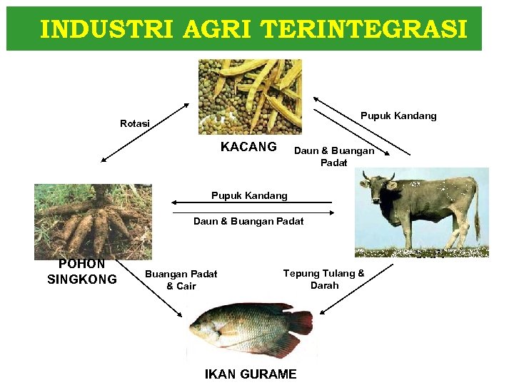 INDUSTRI AGRI TERINTEGRASI Pupuk Kandang Rotasi KACANG Daun & Buangan Padat Pupuk Kandang Daun & Buangan Padat POHON SINGKONG SAPI Buangan Padat & Cair Tepung Tulang & Darah IKAN GURAME