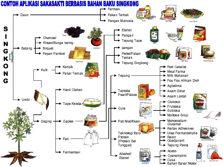 Farmasi Daun Pakan Ternak Pangan Manusia S I N G K O N G Etanol Pangan Charcoal Kreasi/Bunga kering Tepung Tape Briquet pangan Papan Partikel Batang Pellet/Pakan Ternak Tepung Singkong Kulit Keripik Pakar Ternak Tepung Roti Casabe Meal Farina Milk Makanan Fou African Dish Agbelima Hasil Olahan Tapioka Pearl/Flakes Umbi Tape Ketela Gula Daging Gaplek Pati Modifikasi Pati Teknologi Baru Protein (Protein Sel Tunggal) Fermentasi Alkohol/ Etanol Asam Sitrat Asam Laktat Glukosa Fruktosa Sukrosa Maltosa Sirup Monosodium Glutamat Kertas Adhesives Urea Formaidehyde Resin Coadjuvant Tepung Pasta Aceto Cyanohydrin Cuka Bahan Bakar Motor