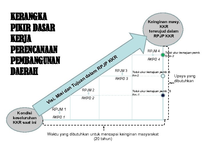 KERANGKA PIKIR DASAR KERJA PERENCANAAN PEMBANGUNAN DAERAH Keinginan masy. KKR terwujud dalam RPJP KKR RPJM 4 R m ala nd a V Kondisi keseluruhan KKR saat ini , isi a id M is n ju Tu RPJM 2 RKPD 2 J RP P KK RPJM 3 RKPD 4 Tolok ukur kemajuan pemb. 5 thn-3 Tolok ukur kemajuan pemb. 5 thn-2 Tolok ukur kemajuan pemb. 5 thn. -1 RPJM 1 RKPD 1 Waktu yang dibutuhkan untuk mencapai keinginan masyarakat (20 tahun) Upaya yang dibutuhkan