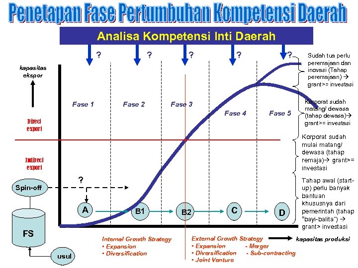Analisa Kompetensi Inti Daerah ? ? ? kapasitas ekspor Fase 1 Fase 2 Fase 3 Fase 4 Fase 5 Direct export Sudah tua perlu peremajaan dan inovasi (Tahap peremajaan) grant>= investasi Korporat sudah matang/ dewasa (tahap dewasa) grant>= investasi Korporat sudah mulai matang/ dewasa (tahap remaja) grant>= investasi Indirect export ? Spin-off A FS usul B 1 Internal Growth Strategy • Expansion • Diversification B 2 C D Tahap awal (startup) perlu banyak bantuan khususnya dari pemerintah (tahap “bayi-balita”) grant> investasi External Growth Strategy kapasitas produksi • Expansion - Merger • Diversification - Sub-contracting • Joint Venture