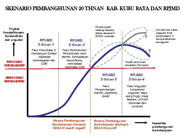 SKENARIO PEMBANGHUNAN 20 THNAN KAB. KUBU RAYA DAN RPJMD Tingkat kesejahteraan, kemandirian dan ungulan Direct export (External growth) Pemda sudah matang/ dewasa (tahap dewasa) APBD< investasi RPJMD 5 thnan-1 Fase Konsolidasi & membangun fondasi : kapasitas kelembagaan dan SDM ? RPJMD 5 thnan-2 ? Fase Pertumbuhan: Pertumbuhan ekon. daerah, kelengkapan fasum/fasos, membattasi eksploitasi SDA Terjadi penurunan kapasitas (Penuaan) RPJMD 5 thnan-3 Indirect export (internal growth) Fase Pengembangan : mandiri, sejjahtera, lestari Neraca Pembangunan Berkelanjutan berbasis SDA/LH masih negatif Innovasi dan kreasi unggulan lokal (peremajaan) mempertahankan keunggulan RPJMD 5 thnan-4 Fase Unggulan : kompetensi unggulan, daya saing tinggi, masy. Madani, LH/SDA terkendali dan produktif Neraca Pembangunan Berkelanjutan (berbasis SDA/LH) positif kapasitas pembangunan berkelanjutan