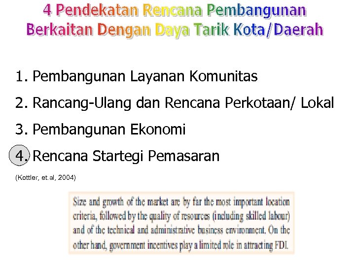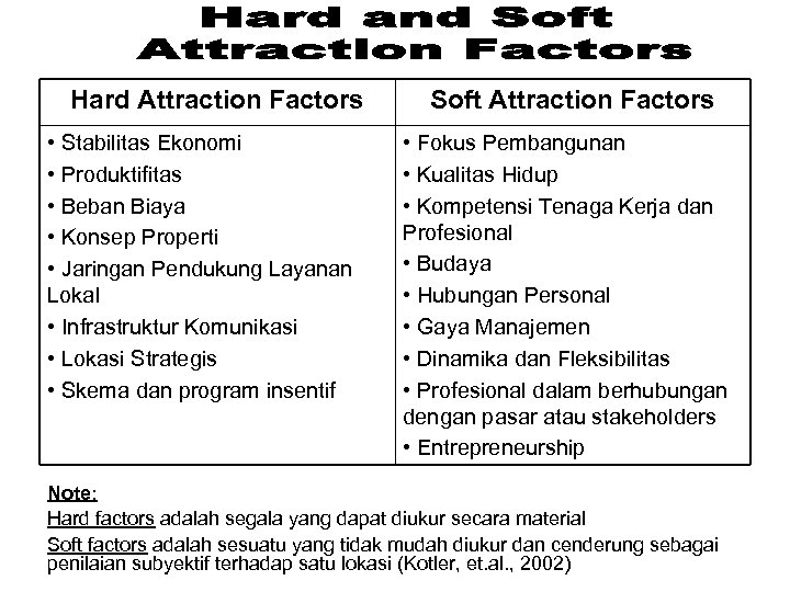 Hard Attraction Factors • Stabilitas Ekonomi • Produktifitas • Beban Biaya • Konsep Properti • Jaringan Pendukung Layanan Lokal • Infrastruktur Komunikasi • Lokasi Strategis • Skema dan program insentif Soft Attraction Factors • Fokus Pembangunan • Kualitas Hidup • Kompetensi Tenaga Kerja dan Profesional • Budaya • Hubungan Personal • Gaya Manajemen • Dinamika dan Fleksibilitas • Profesional dalam berhubungan dengan pasar atau stakeholders • Entrepreneurship Note: Hard factors adalah segala yang dapat diukur secara material Soft factors adalah sesuatu yang tidak mudah diukur dan cenderung sebagai penilaian subyektif terhadap satu lokasi (Kotler, et. al. , 2002)