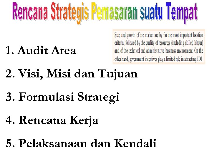 1. Audit Area 2. Visi, Misi dan Tujuan 3. Formulasi Strategi 4. Rencana Kerja 5. Pelaksanaan dan Kendali