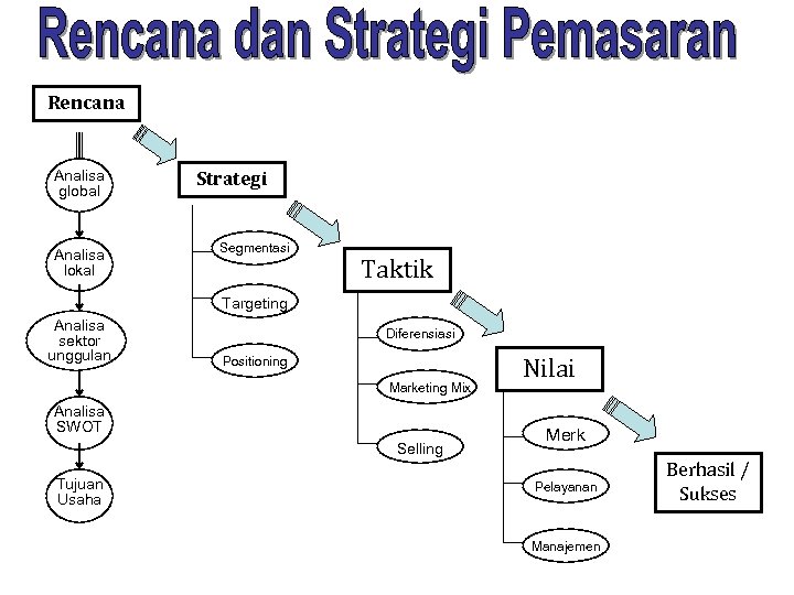 Rencana Analisa global Analisa lokal Strategi Segmentasi Taktik Targeting Analisa sektor unggulan Diferensiasi Positioning Marketing Mix Analisa SWOT Selling Tujuan Usaha Nilai Merk Pelayanan Manajemen Berhasil / Sukses