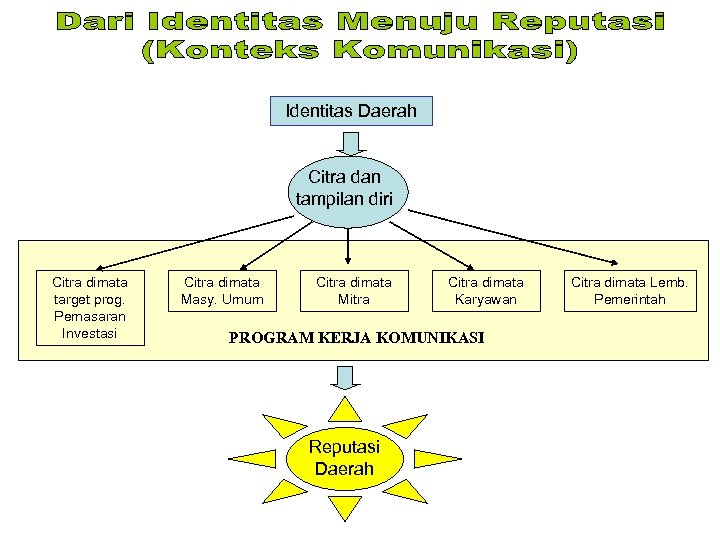 Identitas Daerah Citra dan tampilan diri Citra dimata target prog. Pemasaran Investasi Citra dimata Masy. Umum Citra dimata Mitra Citra dimata Karyawan PROGRAM KERJA KOMUNIKASI Reputasi Daerah Citra dimata Lemb. Pemerintah