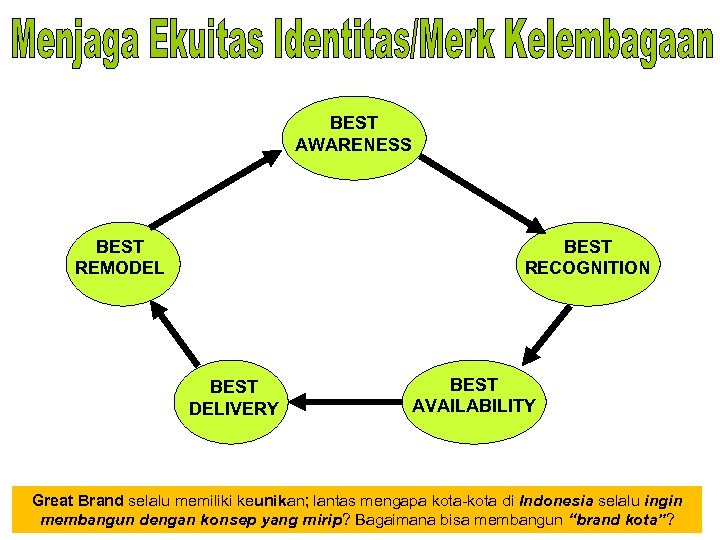 BEST AWARENESS BEST REMODEL BEST RECOGNITION BEST DELIVERY BEST AVAILABILITY Great Brand selalu memiliki keunikan; lantas mengapa kota-kota di Indonesia selalu ingin membangun dengan konsep yang mirip? Bagaimana bisa membangun “brand kota”?