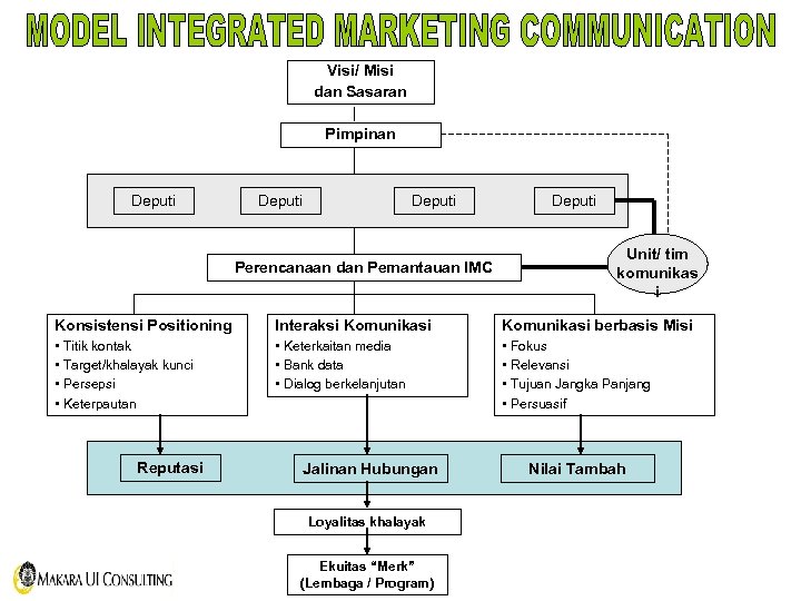 Visi/ Misi dan Sasaran Pimpinan Deputi Perencanaan dan Pemantauan IMC Deputi Unit/ tim komunikas i Konsistensi Positioning Interaksi Komunikasi berbasis Misi • Titik kontak • Target/khalayak kunci • Persepsi • Keterpautan • Keterkaitan media • Bank data • Dialog berkelanjutan • Fokus • Relevansi • Tujuan Jangka Panjang • Persuasif Reputasi Jalinan Hubungan Loyalitas khalayak Ekuitas “Merk” (Lembaga / Program) Nilai Tambah