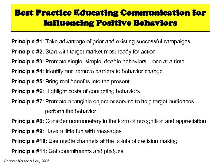 Best Practice Educating Communication for Influencing Positive Behaviors Principle #1: Take advantage of prior and existing successful campaigns Principle #2: Start with target market most ready for action Principle #3: Promote single, simple, doable behaviors – one at a time Principle #4: Identify and remove barriers to behavior change Principle #5: Bring real benefits into the present Principle #6: Highlight costs of competing behaviors Principle #7: Promote a tangible object or service to help target audiences perform the behavior Principle #8: Consider nonmonetary in the form of recognition and appreciation Principle #9: Have a little fun with messages Principle #10: Use media channels at the points of decision making Principle #11: Get commitments and pledges Source: Kottler & Lee, 2006
