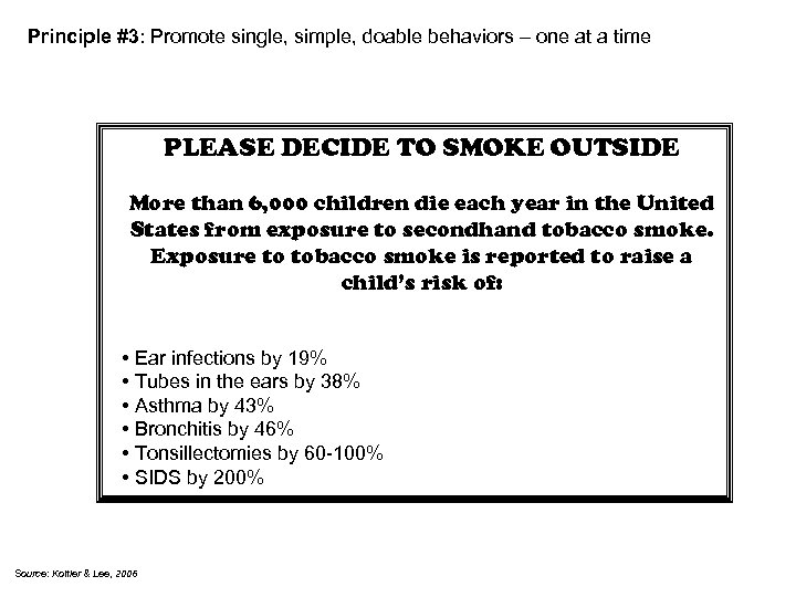 Principle #3: Promote single, simple, doable behaviors – one at a time PLEASE DECIDE TO SMOKE OUTSIDE More than 6, 000 children die each year in the United States from exposure to secondhand tobacco smoke. Exposure to tobacco smoke is reported to raise a child’s risk of: • Ear infections by 19% • Tubes in the ears by 38% • Asthma by 43% • Bronchitis by 46% • Tonsillectomies by 60 -100% • SIDS by 200% Source: Kottler & Lee, 2006