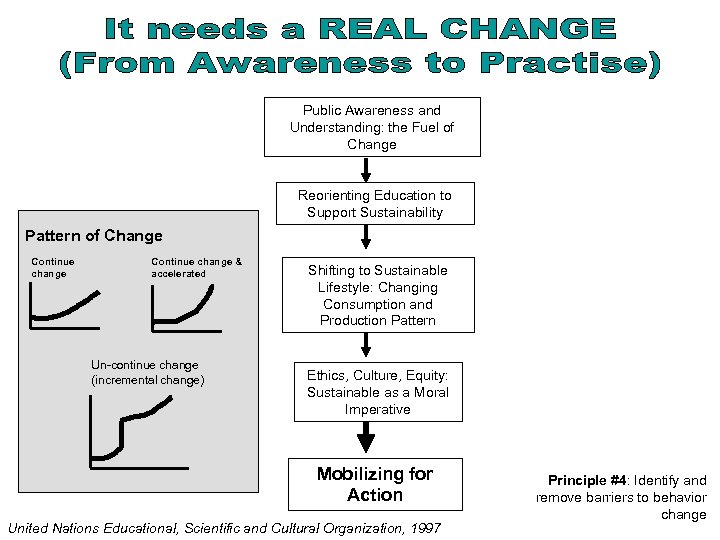 Public Awareness and Understanding: the Fuel of Change Reorienting Education to Support Sustainability Pattern of Change Continue change & accelerated Un-continue change (incremental change) Shifting to Sustainable Lifestyle: Changing Consumption and Production Pattern Ethics, Culture, Equity: Sustainable as a Moral Imperative Mobilizing for Action United Nations Educational, Scientific and Cultural Organization, 1997 Principle #4: Identify and remove barriers to behavior change