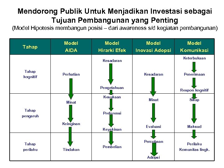 Mendorong Publik Untuk Menjadikan Investasi sebagai Tujuan Pembangunan yang Penting (Model Hipotesis membangun posisi – dari awareness s/d kegiatan pembangunan) Tahap Model AIDA Model Hirarki Efek Model Inovasi Adopsi Keterbukaan Kesadaran Tahap kognitif Perhatian Kesadaran Pengetahuan Kesukaan Minat Tahap pengaruh Penerimaan Respon kognitif Minat Sikap Evaluasi Maksud Preferensi Keinginan Keyakinan Tahap perilaku Model Komunikasi Percobaan Tindakan Pembelian Adopsi Perilaku Komunitas lingk.