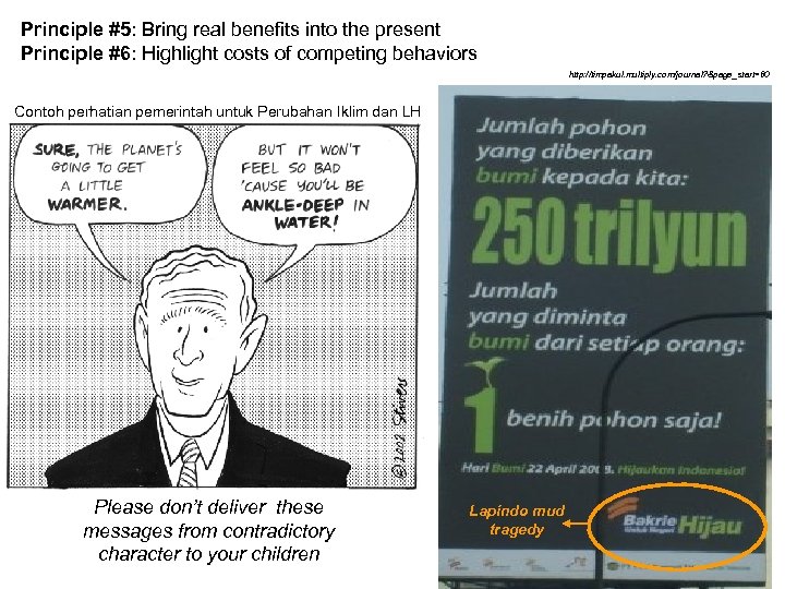 Principle #5: Bring real benefits into the present Principle #6: Highlight costs of competing behaviors http: //timpakul. multiply. com/journal? &page_start=60 Contoh perhatian pemerintah untuk Perubahan Iklim dan LH Please don’t deliver these messages from contradictory character to your children Lapindo mud tragedy