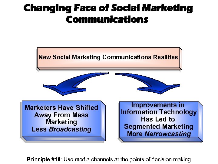 Changing Face of Social Marketing Communications New Social Marketing Communications Realities Marketers Have Shifted Away From Mass Marketing Less Broadcasting Improvements in Information Technology Has Led to Segmented Marketing More Narrowcasting Principle #10: Use media channels at the points of decision making