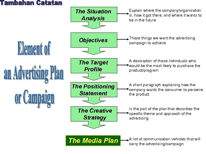 The Situation Analysis Explain where the company/organisation is, how it got there, and where it wants to be in the future Objectives Those things we want the advertising campaign to achieve The Target Profile A description of those individuals who would be the most likely to purchase the product/program The Positioning Statement The Creative Strategy The Media Plan A short paragraph explaining how the company wants the consumer to perceive the product Is the part of the plan that describes the specific theme and approach of the advertising A list of communication vehicles that will carry the advertising/campaign