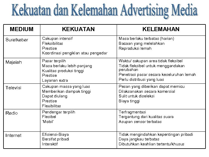 MEDIUM KEKUATAN KELEMAHAN Suratkabar Cakupan intensif Fleksibilitas Prestise Koordinasi pengiklan atau pengedar Masa berlaku terbatas (harian) Bacaan yang melelahkan Reproduksi lemah Majalah Pasar terpilih Masa berlaku lebih panjang Kualitas produksi tinggi Prestise Layanan extra Cakupan massa yang luas Memberikan dampak tinggi Dapat diulang Prestise Flexibilitas Pendengar terpilih Flesibel ‘Mobil’ Waktu/ cakupan area tidak fleksibel Tidak fleksibel untuk menggandakan perubahan Penetrasi pasar secara keseluruhan lemah Perlu distribusi yang luas Efisiensi-Biaya Bersifat pribadi Interaktif Tidak mengindahkan kepentingan pribadi Daya jangkau terbatas Dibutuhkan keahlian tertentu/khusus Televisi Radio Internet Pesan yang diberikan dapat memicu Dilaksanakan secara komersial Sulit untuk diseleksi Biaya tinggi Terfragmentasi Tergantung dari kualitas suara Asupan sensor terbatas