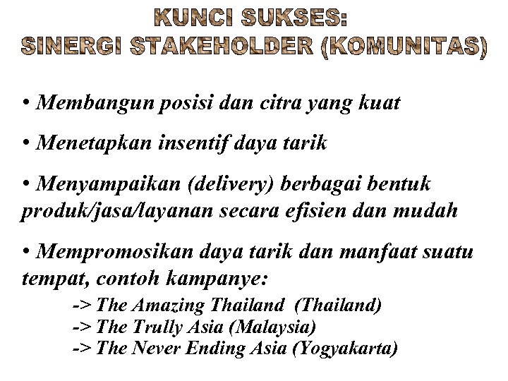 • Membangun posisi dan citra yang kuat • Menetapkan insentif daya tarik • Menyampaikan (delivery) berbagai bentuk produk/jasa/layanan secara efisien dan mudah • Mempromosikan daya tarik dan manfaat suatu tempat, contoh kampanye: -> The Amazing Thailand (Thailand) -> The Trully Asia (Malaysia) -> The Never Ending Asia (Yogyakarta)
