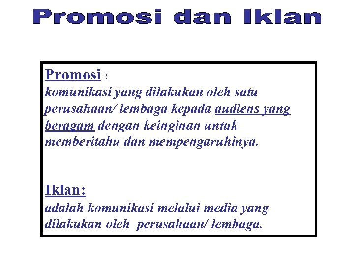 Promosi : komunikasi yang dilakukan oleh satu perusahaan/ lembaga kepada audiens yang beragam dengan keinginan untuk memberitahu dan mempengaruhinya. Iklan: adalah komunikasi melalui media yang dilakukan oleh perusahaan/ lembaga.