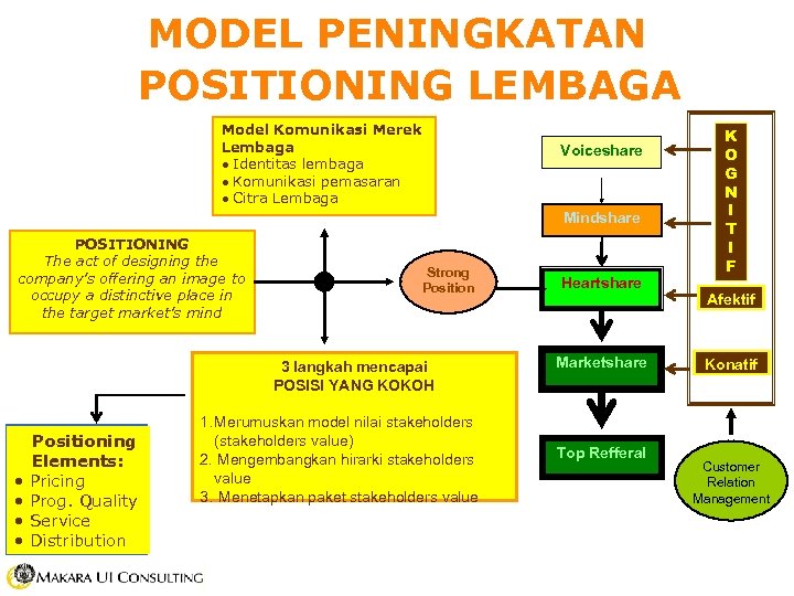 MODEL PENINGKATAN POSITIONING LEMBAGA Model Komunikasi Merek Lembaga · Identitas lembaga · Komunikasi pemasaran · Citra Lembaga Voiceshare Mindshare POSITIONING The act of designing the company’s offering an image to occupy a distinctive place in the target market’s mind Strong Position 3 langkah mencapai POSISI YANG KOKOH • • Positioning Elements: Pricing Prog. Quality Service Distribution 1. Merumuskan model nilai stakeholders (stakeholders value) 2. Mengembangkan hirarki stakeholders value 3. Menetapkan paket stakeholders value Heartshare Marketshare Top Refferal K O G N I T I F Afektif Konatif Customer Relation Management