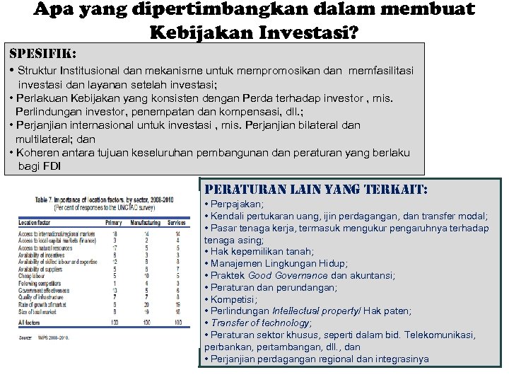 Apa yang dipertimbangkan dalam membuat Kebijakan Investasi? spesifik: • Struktur Institusional dan mekanisme untuk mempromosikan dan memfasilitasi investasi dan layanan setelah investasi; • Perlakuan Kebijakan yang konsisten dengan Perda terhadap investor , mis. Perlindungan investor, penempatan dan kompensasi, dll. ; • Perjanjian internasional untuk investasi , mis. Perjanjian bilateral dan multilateral; dan • Koheren antara tujuan keseluruhan pembangunan dan peraturan yang berlaku bagi FDI peraturan lain yang terkait: • Perpajakan; • Kendali pertukaran uang, ijin perdagangan, dan transfer modal; • Pasar tenaga kerja, termasuk mengukur pengaruhnya terhadap tenaga asing; • Hak kepemilikan tanah; • Manajemen Lingkungan Hidup; • Praktek Good Governance dan akuntansi; • Peraturan dan perundangan; • Kompetisi; • Perlindungan Intellectual property/ Hak paten; • Transfer of technology; • Peraturan sektor khusus, seperti dalam bid. Telekomunikasi, perbankan, pertambangan, dll. , dan • Perjanjian perdagangan regional dan integrasinya