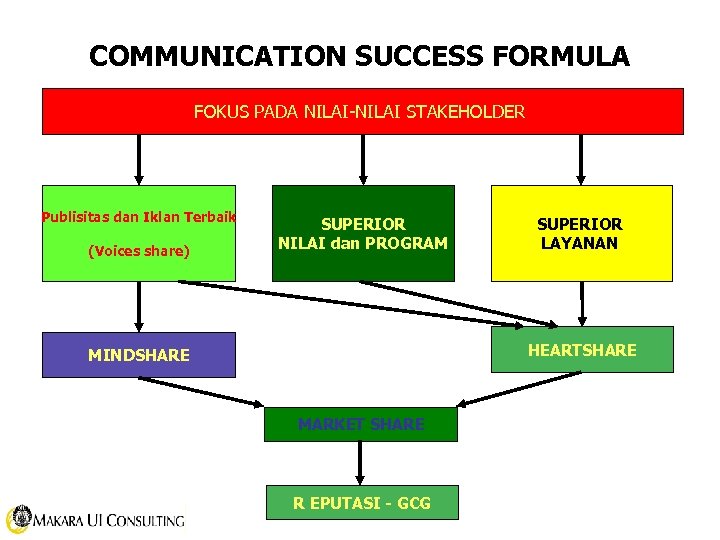 COMMUNICATION SUCCESS FORMULA FOKUS PADA NILAI-NILAI STAKEHOLDER Publisitas dan Iklan Terbaik (Voices share) SUPERIOR NILAI dan PROGRAM SUPERIOR LAYANAN HEARTSHARE MINDSHARE MARKET SHARE R EPUTASI - GCG