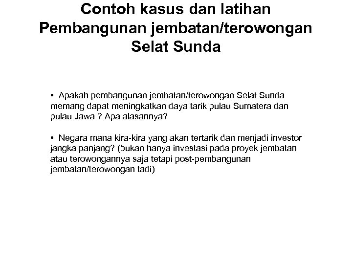 Contoh kasus dan latihan Pembangunan jembatan/terowongan Selat Sunda • Apakah pembangunan jembatan/terowongan Selat Sunda memang dapat meningkatkan daya tarik pulau Sumatera dan pulau Jawa ? Apa alasannya? • Negara mana kira-kira yang akan tertarik dan menjadi investor jangka panjang? (bukan hanya investasi pada proyek jembatan atau terowongannya saja tetapi post-pembangunan jembatan/terowongan tadi)