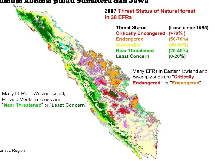 umum kondisi pulau Sumatera dan Jawa 2007 Threat Status of Natural forest in 38 EFRs Threat Status Critically Endangered Vulnerable Near Threatened Least Concern (Loss since 1985) (>70% ) (50 -70%) (40 -50%) (20 -40%) (0 -20%) Many EFRs in Eastern lowland Swamp zones are “Critically Endangered ” or “Endangered”. Many EFRs in Western coast, Hill and Montane zones are “Near Threatened” or “Least Concern”. oristic Region