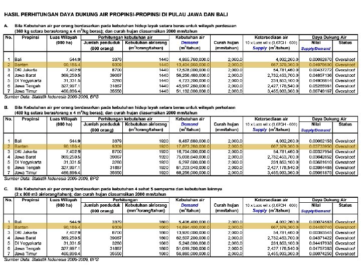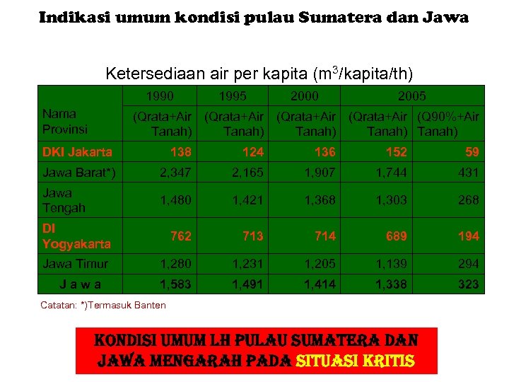 5. Indikasi umum kondisi pulau Sumatera dan Jawa Air Ketersediaan air per kapita (m 3/kapita/th) 1990 1995 2000 2005 (Qrata+Air Tanah) (Qrata+Air (Q 90%+Air Tanah) DKI Jakarta 138 124 136 152 59 Jawa Barat*) 2, 347 2, 165 1, 907 1, 744 431 Jawa Tengah 1, 480 1, 421 1, 368 1, 303 268 DI Yogyakarta 762 713 714 689 194 Jawa Timur 1, 280 1, 231 1, 205 1, 139 294 1, 583 1, 491 1, 414 1, 338 323 Nama Provinsi Jawa Catatan: *)Termasuk Banten kondisi umum lh pulau sumatera dan jawa mengarah pada situasi kritis