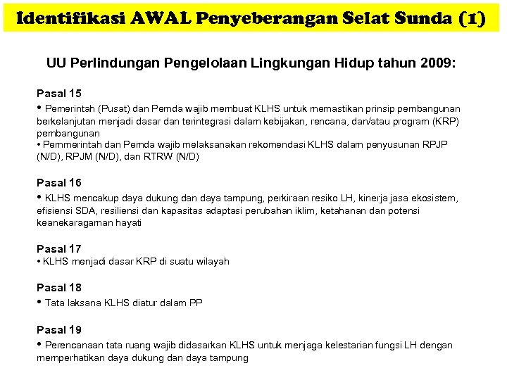 Identifikasi AWAL Penyeberangan Selat Sunda (1) UU Perlindungan Pengelolaan Lingkungan Hidup tahun 2009: Pasal 15 • Pemerintah (Pusat) dan Pemda wajib membuat KLHS untuk memastikan prinsip pembangunan berkelanjutan menjadi dasar dan terintegrasi dalam kebijakan, rencana, dan/atau program (KRP) pembangunan • Pemmerintah dan Pemda wajib melaksanakan rekomendasi KLHS dalam penyusunan RPJP (N/D), RPJM (N/D), dan RTRW (N/D) Pasal 16 • KLHS mencakup daya dukung dan daya tampung, perkiraan resiko LH, kinerja jasa ekosistem, efisiensi SDA, resiliensi dan kapasitas adaptasi perubahan iklim, ketahanan dan potensi keanekaragaman hayati Pasal 17 • KLHS menjadi dasar KRP di suatu wilayah Pasal 18 • Tata laksana KLHS diatur dalam PP Pasal 19 • Perencanaan tata ruang wajib didasarkan KLHS untuk menjaga kelestarian fungsi LH dengan memperhatikan daya dukung dan daya tampung