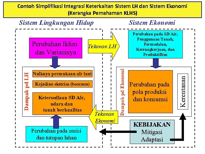 Contoh Simplifikasi Integrasi Keterkaitan Sistem LH dan Sistem Ekonomi (Kerangka Pemahaman KLHS) Sistem Lingkungan Hidup Kejadian ekstrim (bencana) Perubahan pada emisi dan tutupan lahan Tekanan Ekonomi Perubahan pada pola produksi dan konsumsi KEBIJAKAN Mitigasi Adaptasi Kerentanan Tekanan LH Naiknya permukaan air laut Ketersediaan SD Air, udara dan tanah berkualitas Perubahan pada SD Air, Penggunaan Tanah, Permodalan, Ketenagkerjaan, dan Produktifitas Dampak pd Ekonomi Dampak pd LH Perubahan Iklim dan Variasinya Sistem Ekonomi