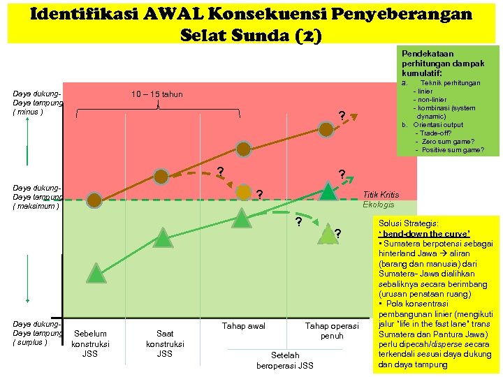 Identifikasi AWAL Konsekuensi Penyeberangan Selat Sunda (2) Pendekataan perhitungan dampak kumulatif: a. Daya dukung. Daya tampung ( minus ) 10 – 15 tahun ? ? Daya dukung. Daya tampung ( maksimum ) ? ? Titik Kritis Ekologis ? Daya dukung. Daya tampung ( surplus ) Teknik perhitungan - linier - non-linier - kombinasi (system dynamic) b. Orientasi output - Trade-off? - Zero sum game? - Positive sum game? Sebelum konstruksi JSS Saat konstruksi JSS Tahap awal ? Tahap operasi penuh Setelah beroperasi JSS Solusi Strategis: ‘ bend-down the curve’ • Sumatera berpotensi sebagai hinterland Jawa aliran (barang dan manusia) dari Sumatera- Jawa dialihkan sebaliknya secara berimbang (urusan penataan ruang) • Pola konsentrasi pembangunan linier (mengikuti jalur “life in the fast lane” trans Sumatera dan Pantura Jawa) perlu dipecah/disperse secara terkendali sesuai daya dukung dan daya tampung