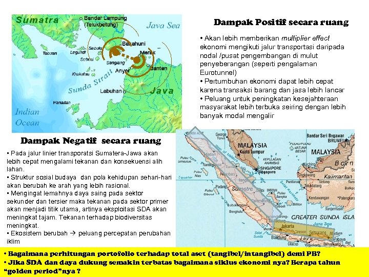 Dampak Positif secara ruang • Akan lebih memberikan multiplier effect ekonomi mengikuti jalur transportasi daripada nodal /pusat pengembangan di mulut penyeberangan (seperti pengalaman Eurotunnel) • Pertumbuhan ekonomi dapat lebih cepat karena transaksi barang dan jasa lebih lancar • Peluang untuk peningkatan kesejahteraan masyarakat lebih terbuka seiring dengan lebih banyak modal mengalir Dampak Negatif secara ruang • Pada jalur linier transporatsi Sumatera-Jawa akan lebih cepat mengalami tekanan dan konsekuensi alih lahan. • Struktur sosial budaya dan pola kehidupan sehari-hari akan berubah ke arah yang lebih rasional. • Mengingat lemahnya daya saing pada sektor sekunder dan tersier maka tekanan pada sektor primer akan menjadi titik utama, artinya eksploitasi SDA akan meningkat tajam. Tekanan terhadap biodiversitas meningkat. • Ekosistem berubah peluang percepatan perubahan iklim • Bagaimana perhitungan portofolio terhadap total aset (tangibel/intangibel) demi PB? • Jika SDA dan daya dukung semakin terbatas bagaimana siklus ekonomi nya? Berapa tahun “golden period”nya ?