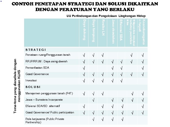 CONTOH PENETAPAN STRATEGI DAN SOLUSI DIKAITKAN DENGAN PERATURAN YANG BERLAKU UU Perlindungan dan Pengelolaan Lingkungan Hidup RPJP/RPJM : Daya saing daerah √ √ √ Pemanfaatan SDA √ Good Governance √ √ Investasi √ √ Keanekaragama n hayati √ Mitigasi dan Adaptasi terhadap perubahan iklim Resiko LH √ Efisiensi SDA Daya tampung √ Jasa ekosistem Daya dukung Penataan ruang/Penggunaan tanah √ √ Tema-tema yang dianalisis dengan menggunakan KLHS STRATEGI √ √ √ √ √ SOLUSI Manajemen penggunaan tanah (P 4 T) Jawa – Sumatera Incorporate √ Efisiensi SDA/SD alternatif √ √ √ √ Good Governance/ Public participation √ Pola kerjasama (Public Private Partnership) √ √ √