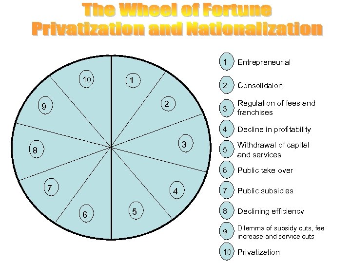 1 2 3 2 9 3 8 7 4 6 5 Regulation of fees and franchises Decline in profitability 5 Withdrawal of capital and services 6 1 Consolidaion 4 10 Entrepreneurial Public take over 7 Public subsidies 8 Declining efficiency 9 Dilemma of subsidy cuts, fee increase and service cuts 10 Privatization