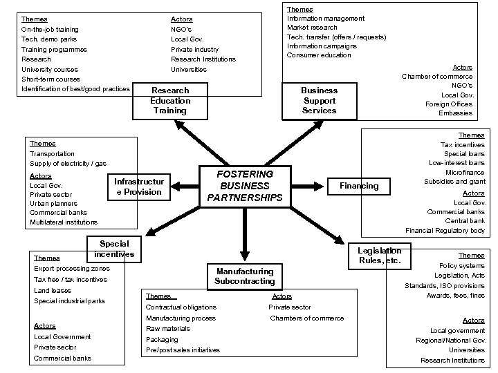 Themes On-the-job training Tech. demo parks Training programmes Research University courses Short-term courses Identification of best/good practices Themes Information management Market research Tech. transfer (offers / requests) Information campaigns Consumer education Actors NGO’s Local Gov. Private industry Research Institutions Universities Research Education Training Actors Chamber of commerce NGO’s Local Gov. Foreign Offices Embassies Business Support Services Themes Transportation Supply of electricity / gas Actors Local Gov. Private sector Urban planners Commercial banks Multilateral institutions Themes Infrastructur e Provision FOSTERING BUSINESS PARTNERSHIPS Financing Special incentives Legislation Rules, etc. Export processing zones Manufacturing Subcontracting Tax free / tax incentives Land leases Special industrial parks Themes Actors Contractual obligations Chambers of commerce Actors Raw materials Local Government Packaging Private sector Pre/post sales initiatives Commercial banks Actors Local Gov. Commercial banks Central bank Financial Regulatory body Themes Policy systems Legislation, Acts Standards, ISO provisions Awards, fees, fines Private sector Manufacturing process Themes Tax incentives Special loans Low-interest loans Microfinance Subsidies and grant Actors Local government Regional/National Gov. Universities Research Institutions