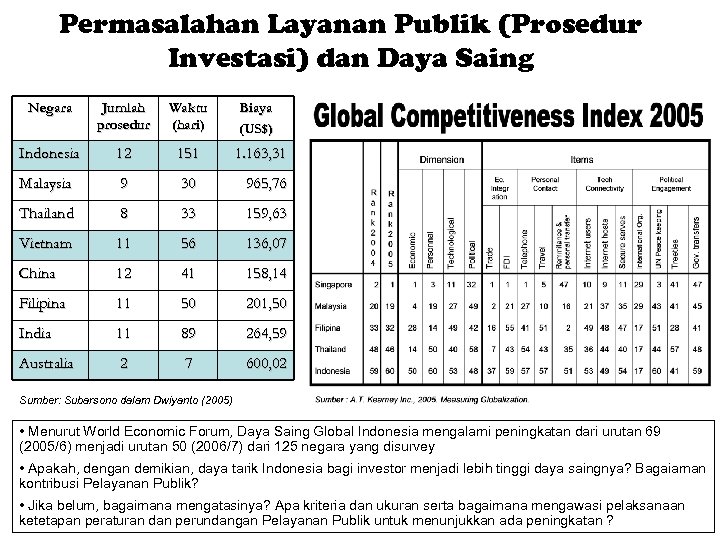 Permasalahan Layanan Publik (Prosedur Investasi) dan Daya Saing Negara Jumlah prosedur Waktu (hari) Biaya (US$) Indonesia 12 151 1. 163, 31 Malaysia 9 30 965, 76 Thailand 8 33 159, 63 Vietnam 11 56 136, 07 China 12 41 158, 14 Filipina 11 50 201, 50 India 11 89 264, 59 Australia 2 7 600, 02 Sumber: Subarsono dalam Dwiyanto (2005) • Menurut World Economic Forum, Daya Saing Global Indonesia mengalami peningkatan dari urutan 69 (2005/6) menjadi urutan 50 (2006/7) dari 125 negara yang disurvey • Apakah, dengan demikian, daya tarik Indonesia bagi investor menjadi lebih tinggi daya saingnya? Bagaiaman kontribusi Pelayanan Publik? • Jika belum, bagaimana mengatasinya? Apa kriteria dan ukuran serta bagaimana mengawasi pelaksanaan ketetapan peraturan dan perundangan Pelayanan Publik untuk menunjukkan ada peningkatan ?
